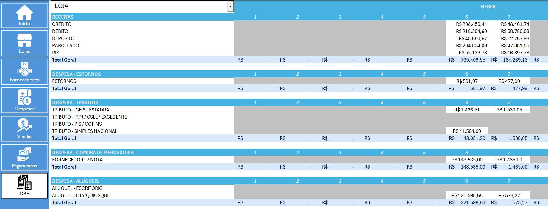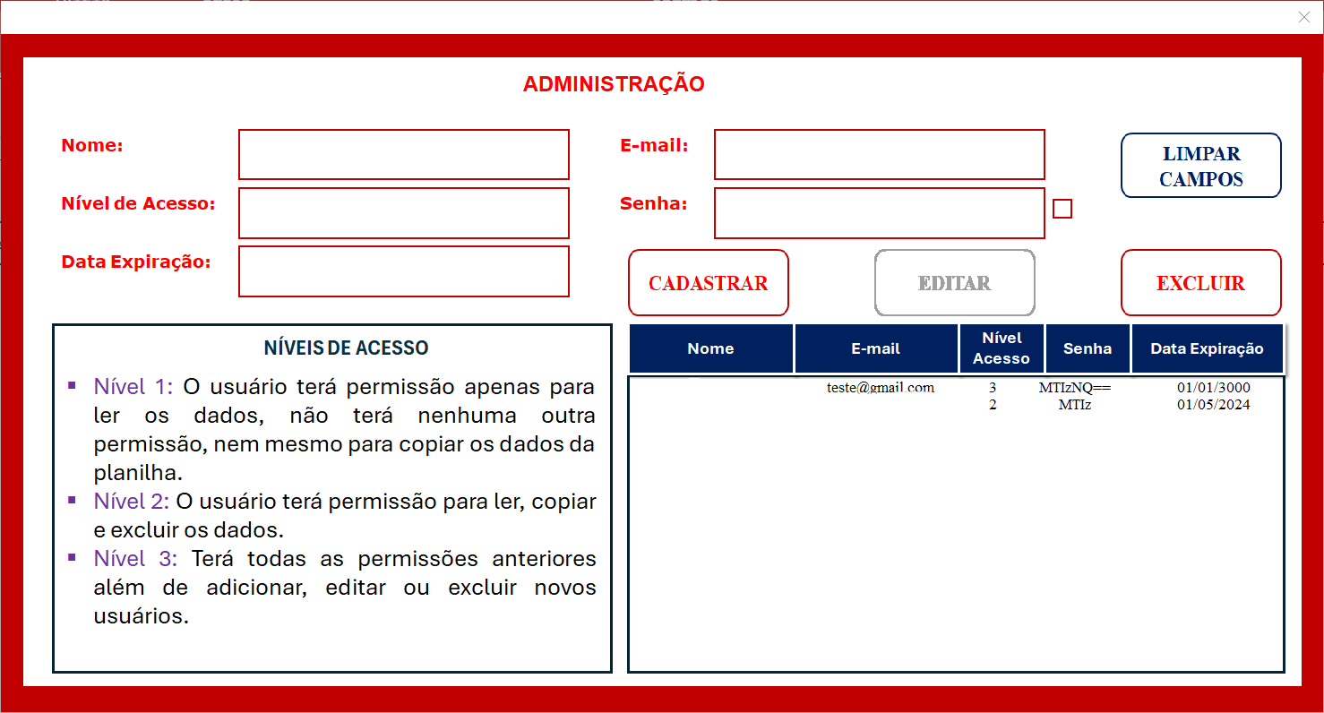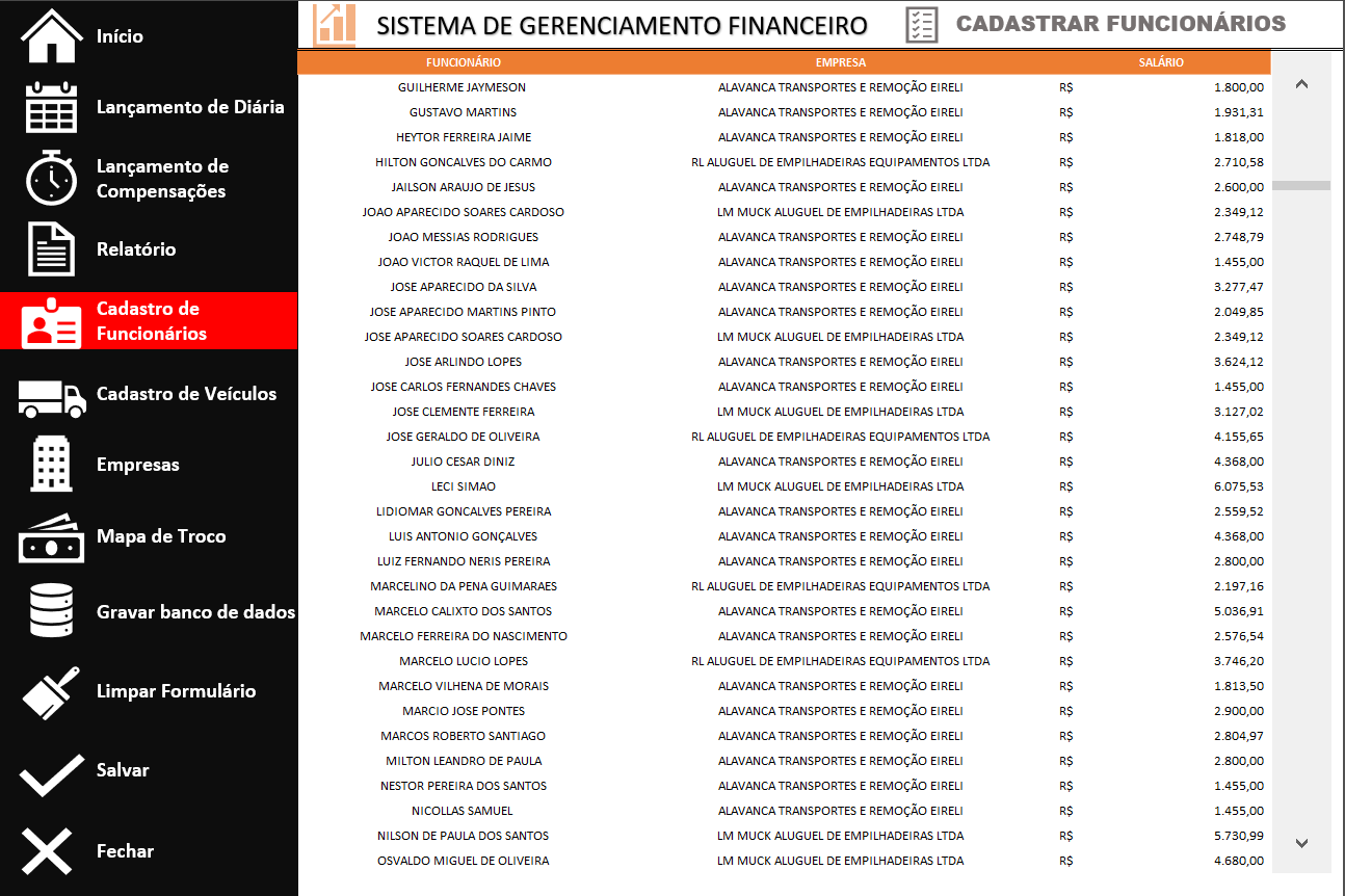 A finalidade neste projeto foi desenvolver uma planilha tipo "sistema", com formulários de entrada de dados, implementação de menus laterais para facilitar a navegação e várias automatizações por meio de códigos VBA.